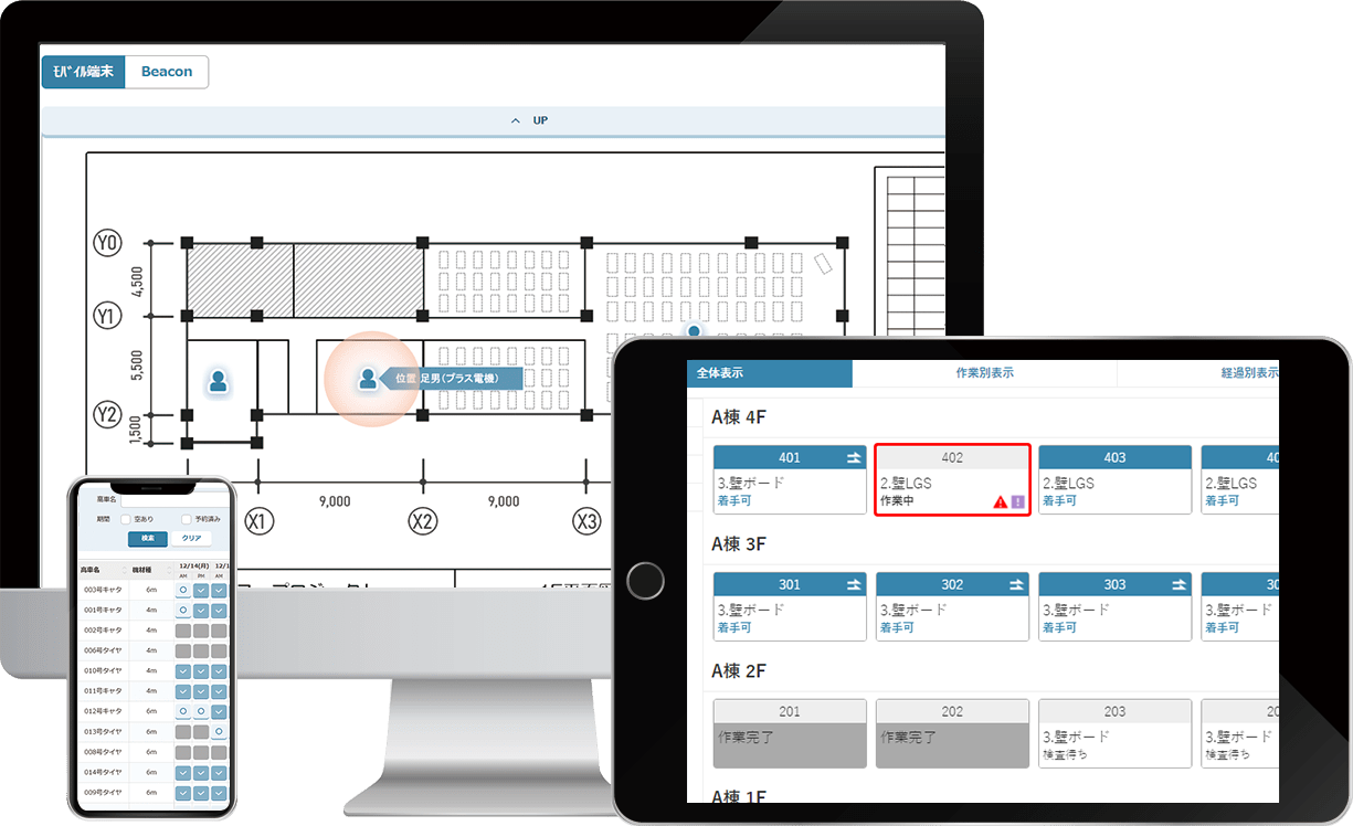 「位置プラス®」シリーズは、業務効率化アプリと位置認識プラットフォームからなります。 業務効率化アプリとして、人の位置を探索できる「位置プラス®探」、高所作業車の予約管理を行える「高車管理」、工事の進捗管理を行える「進捗管理」があり、これまで50カ所以上の施工現場に適用され、日々進化をしています。 位置認識プラットフォームは、現場に設置したBluetooth Low Energy(BLE)ビーコンや2次元バーコードの情報を簡単にサーバーに登録でき、GPS等とも組み合わせて、建設現場の内外で人・もの・機械の位置を把握できる環境を提供します。 これらを組み合わせて、建設現場の業務を効率化します