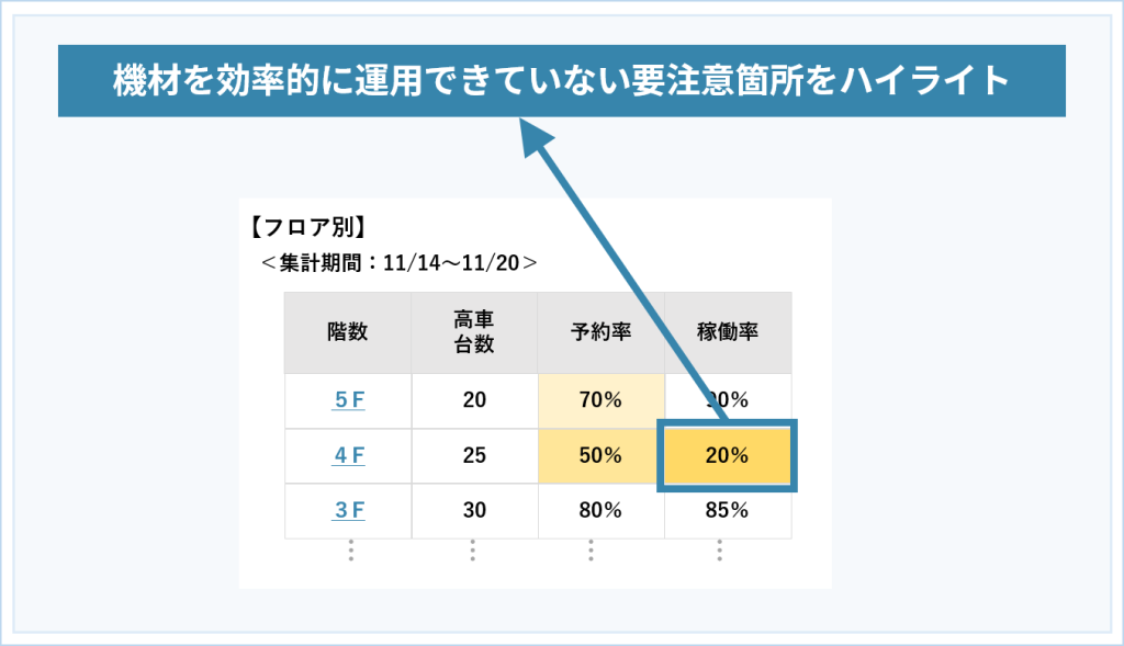 全貌が分かる概要画面では、高車の予約率が低いフロアや稼働率が低い高車をハイライト表示、詳細画面では、予約をしているのに実際は使っていない非効率な箇所を表示、改善アクションが必要なことが分かります。これまで以上に高効率な高車運用を実現できます。