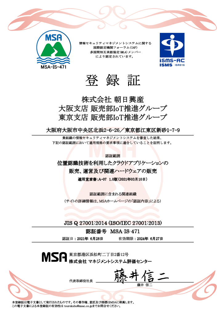 弊社販売部IoT推進グループは、情報セキュリティマネジメントシステム(ISMS)に関する